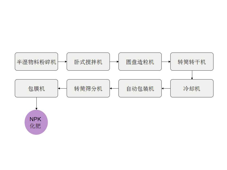 復(fù)合肥的生產(chǎn)工藝主要是以單體的基礎(chǔ)肥料(尿素、硝銨、氯化銨等)為原料,經(jīng)粉碎至一定細(xì)度后,物料在造粒機(jī)的滾動(dòng)床內(nèi)通過(guò)增濕、加熱進(jìn)行團(tuán)聚造粒,在成粒過(guò)程中,有條件的還可以在造粒機(jī)加入少量的磷酸和氨,以改善成粒條件。造粒物料經(jīng)干燥、篩分、冷卻即得到NPK復(fù)合肥料產(chǎn)品。