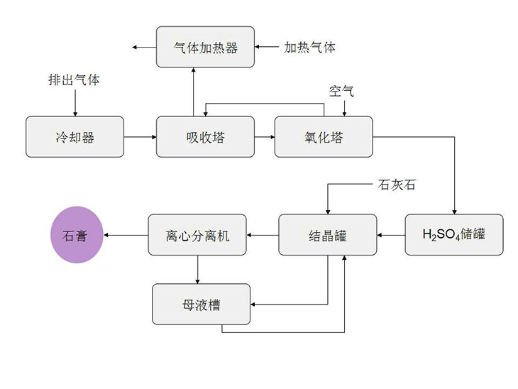 燃燒氣體在冷卻器中被冷卻到50-70℃,送入吸收塔,由上部來的稀硫酸將SO2氣體吸收除去入大氣。稀硫酸中的SO2在氧化塔內生成硫酸,返回吸收塔。一定量的稀硫酸在結晶罐內生成石膏,石膏經過離心分離機后與母液分開。母液由母液槽返回到吸收塔,石膏結晶進行脫水,直到容易處理的程度為止。